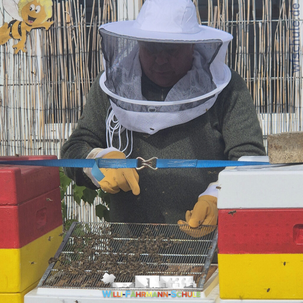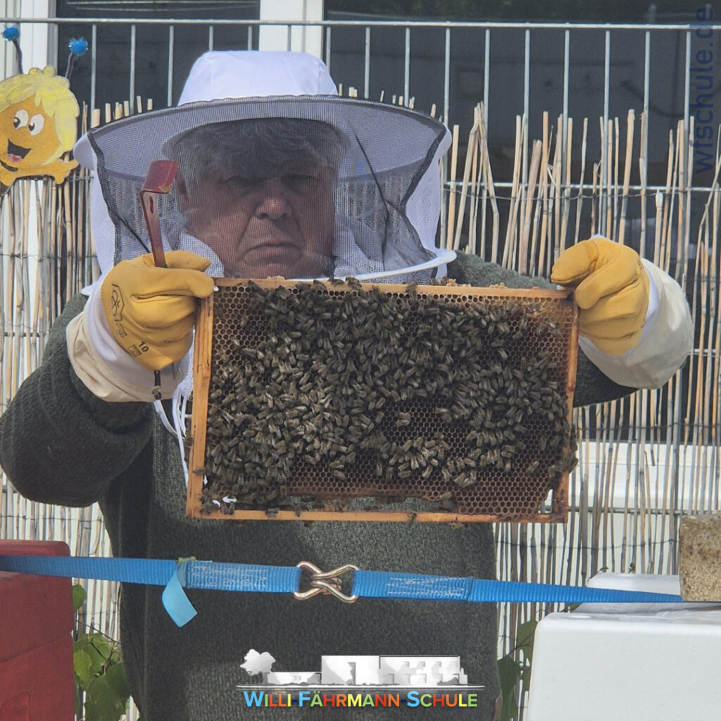 Die Schülerinnen und Schüler verfolgen aufmerksam die spannenden Erzählungen von Herrn Hoppe und beteiligen sich mit großem Interesse mit vielen Fragen. Dabei lernen sie auch die Bedeutung der Schulbienen kennen, erfahren, wie ein Bienenstock aufgebaut ist und warum Bienen für unsere Umwelt so wichtig sind. Vielen Dank dafür!